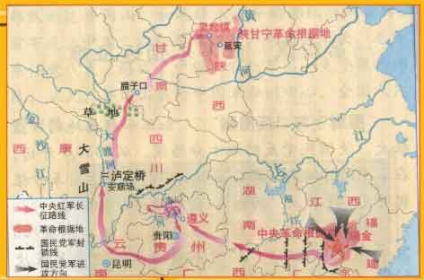 1934~1936年間,中國(guó)工農(nóng)紅軍主力從長(zhǎng)江南北各蘇區(qū)向陜甘革命根據(jù)地(亦稱陜甘蘇區(qū))的戰(zhàn)略轉(zhuǎn)移。