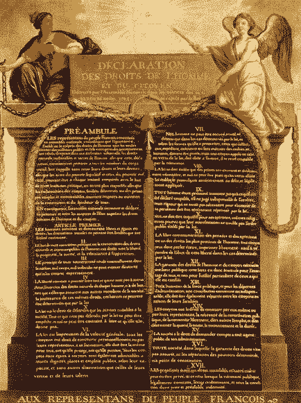 1789年8月26日頒布的《人權(quán)宣言》,是在法國大革命時期頒布的綱領(lǐng)性文件!度藱(quán)宣言》宣布自由、財產(chǎn)、安全和反抗壓迫是天賦不可剝奪的人權(quán),肯定了言論、信仰、著作和出版自由,闡明了司法、行政、立法三權(quán)分立、法律面前人人平等、私有財產(chǎn)神圣不可侵犯等原則。是法國大革命頒布的綱領(lǐng)性文件。