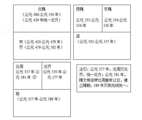 北魏統(tǒng)一北方后,從439-581年,大約與南朝同一時(shí)期,我國(guó)北方先后出現(xiàn)了少數(shù)民族建立的北魏、東魏、西魏、北齊、北周5個(gè)政權(quán),歷史成為北朝。北朝與南朝長(zhǎng)期對(duì)峙,合稱為南北朝。