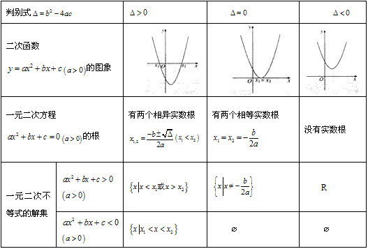 使某個一元二次不等式成立的x的值叫做這個一元二次不等式的解,一元二次不等式的所有解組成的集合叫做這個一元二次不等式的解集。
