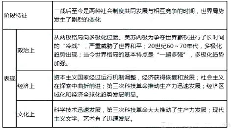 1.政治上:兩極格局形成,美蘇長(zhǎng)期冷戰(zhàn)爭(zhēng)霸,造成國(guó)際局勢(shì)長(zhǎng)期動(dòng)蕩不安;20世紀(jì)70年代以后,兩極格局受到?jīng)_擊,多極化趨勢(shì)日益明顯;資本主義國(guó)家通過(guò)社會(huì)改革,穩(wěn)定了社會(huì)秩序,但仍存在社會(huì)危機(jī);西歐、日本由唯美國(guó)馬首是瞻到開(kāi)展反對(duì)美國(guó)控制的斗爭(zhēng);社會(huì)主義陣營(yíng)的形成與解體;世界殖民體系走向崩潰;第三世界崛起。
