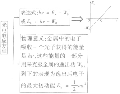 Ek=hυ-W(Ek是光電子的最大初動(dòng)能;W是逸出功,即從金屬表面直接飛出的光電子克服正電荷引力所做的功。)
