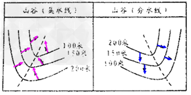 (1)水系特征:山地常形成放射狀水系;盆地常形成向心狀水系;山脊常形成分水嶺(山脊處等高線彎曲最大處的連線稱分水線);山谷常有河流發(fā)育,等高線穿越河谷時向上游彎曲,即河流流向與等高線凸出方向相反。