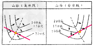 (4)彎曲狀況——等高線向地勢低的方向凸,則為山脊;相反則為山谷。