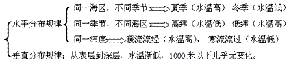 海洋表層的溫度狀況是低緯度海區(qū)的水溫高,高緯度海區(qū)的水溫低;在同一海區(qū),夏季的水溫高些,冬季的水溫低些;與同緯度海區(qū)相比,有暖流流過的海區(qū),水溫高些,有寒流流過的海區(qū),水溫要低些。