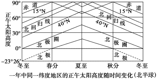 一年中同一緯度地區(qū)的正午太陽告訴隨時間變化圖:(北半球)