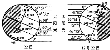 如當(dāng)太陽直射在北回歸線(23°26′N)時,切點B的緯度為66°34′N。