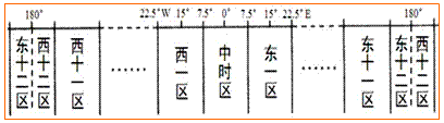 2)以0°經(jīng)線為中央經(jīng)線,向東、西方向各取7.5°,合計為15°,該時區(qū)稱為中時區(qū)(或零時區(qū))。