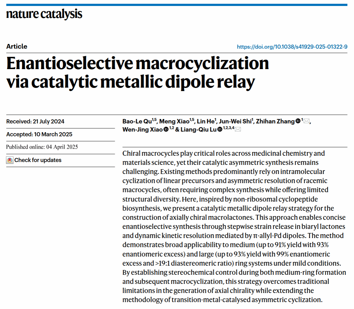 華大在線(xiàn)訊(通訊員 周漢鳴)4月4日,我校化學(xué)學(xué)院肖文精教授團(tuán)隊(duì)在國(guó)際頂級(jí)期刊《自然催化》(Nature Catalysis)發(fā)表題為"催化的金屬偶極體接力實(shí)現(xiàn)對(duì)映選擇性大環(huán)化"(Enantioselective macrocyclization via catalytic metallic dipole relay)的研究論文。該研究創(chuàng)新性地提出了"金屬偶極體接力"策略,為軸手性大環(huán)化合物的高效合成開(kāi)辟了新路徑。華中師范大學(xué)博士研究生曲寶樂(lè)(實(shí)驗(yàn)研究)和肖萌(理論計(jì)算)為共同第一作者,陸良秋教授和張之涵教授為共同通訊作者,我校為第一完成單位。