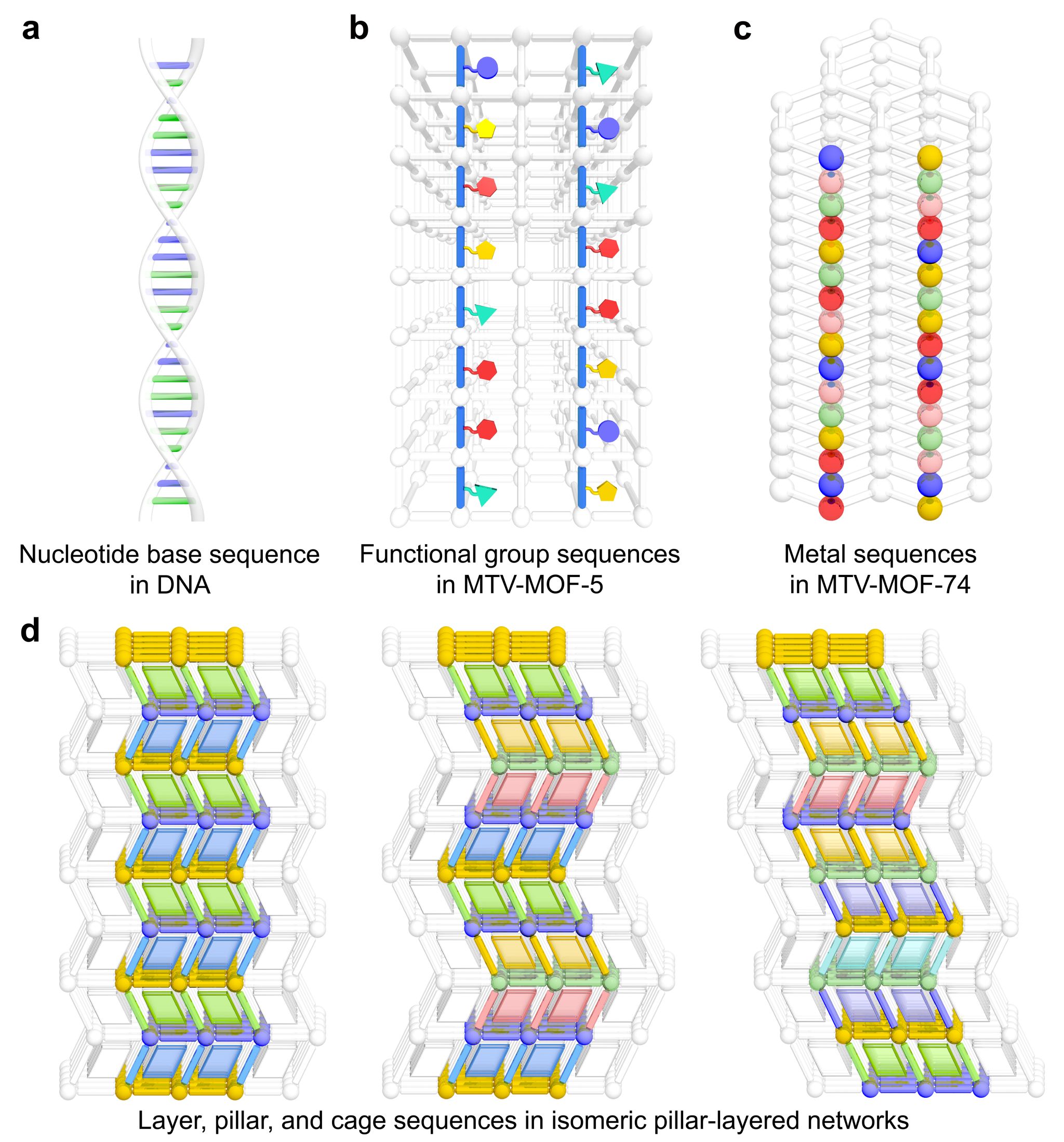 金屬有機(jī)框架材料(MOFs)具有模塊化的組裝模式和高度有序、明確的晶體結(jié)構(gòu),是有望實(shí)現(xiàn)精準(zhǔn)序列調(diào)控的合成材料之一。基于此,涂斌斌副教授團(tuán)隊(duì)首先在框架化學(xué)結(jié)構(gòu)數(shù)據(jù)庫(Reticular Chemistry Structure Resource)中篩選出同分異構(gòu)的層柱狀muo,umt 和toz拓?fù)淇蚣埽鋵咏M成相同,但呈現(xiàn)出不同的排列方式,形成了多樣化的層序列,即結(jié)構(gòu)的“基因”。同時(shí),插入層之間的柱子會形成具有方向性的不同Z字形柱序列。此外,不同框架中的層和柱序列組合產(chǎn)生了方向性明確的多樣化孔序列。進(jìn)而通過深入的解構(gòu)分析,揭示了上述框架的構(gòu)筑規(guī)律,并將其編成代碼,借助Python成功地預(yù)測了近2000種序列可調(diào)且具備原子級精準(zhǔn)性的框架,且極大地豐富了框架化學(xué)結(jié)構(gòu)數(shù)據(jù)庫。