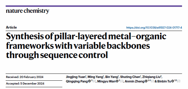 華大在線訊(通訊員 周漢鳴)近日,化學(xué)學(xué)院涂斌斌副教授團(tuán)隊(duì)在金屬有機(jī)框架序列調(diào)控方面取得了重要進(jìn)展。該研究成果在國際化學(xué)領(lǐng)域權(quán)威期刊《自然化學(xué)》(Nature Chemistry)發(fā)表,題為“Synthesis of backbone variable pillar-layered metal–organic frameworks through sequence control”(Nat. Chem. 2025, 17, 421-428)。博士研究生元靜靜為論文第一作者,通訊作者為武漢科技大學(xué)龐青青講師、萬明宇特任教授、鄭安民教授和我校涂斌斌副教授(最后通訊作者),第一完成單位為華中師范大學(xué)。