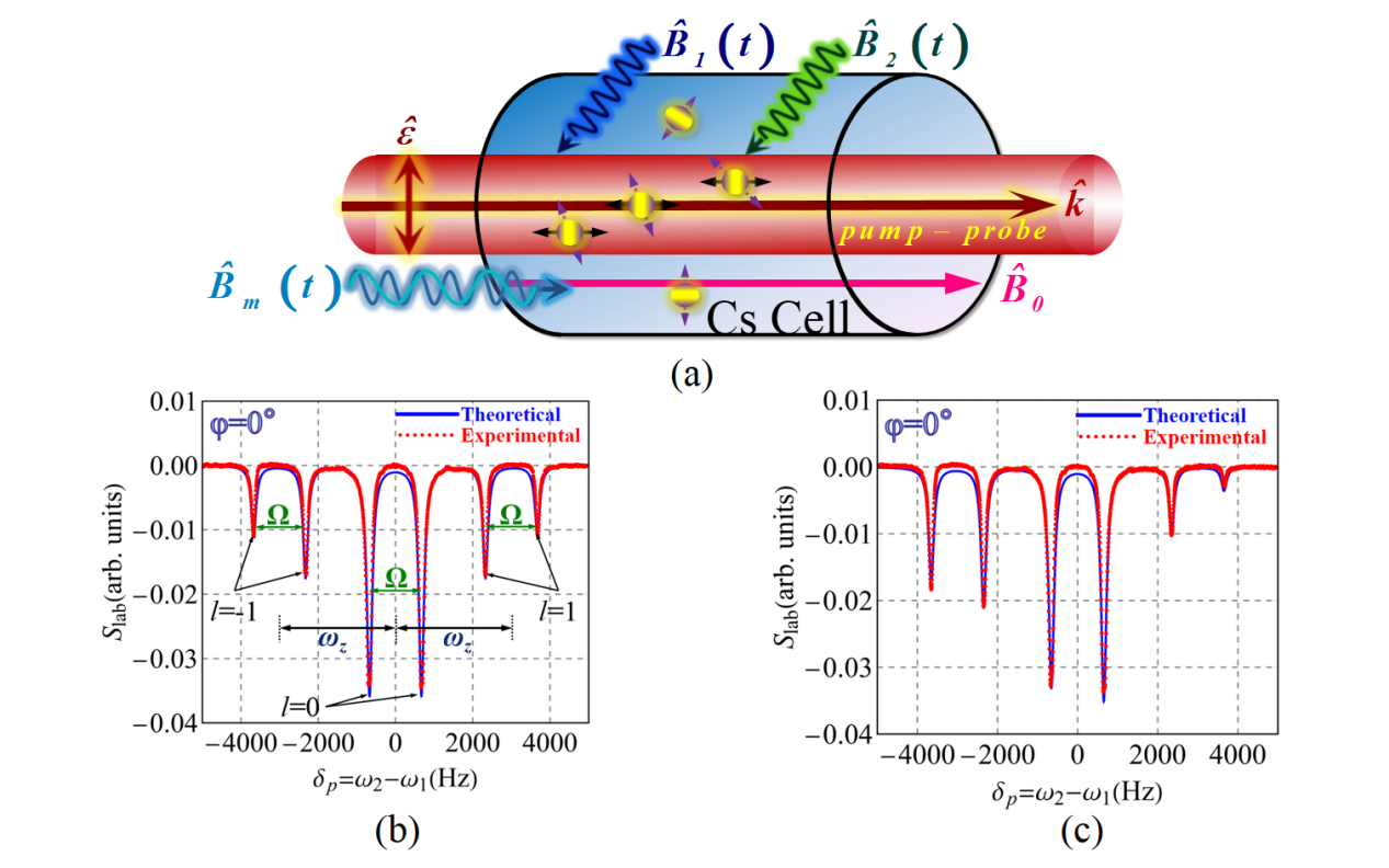 針對(duì)這一問(wèn)題,該研究團(tuán)隊(duì)提出了弗洛凱調(diào)制角動(dòng)量為J(J≥1)的多能級(jí)熱原子磁共振系統(tǒng)高階極化矩廣義宇稱理論,研究了具有廣義宇稱的張量極化矩(alignment)的性質(zhì),揭示了廣義宇稱保護(hù)高階極化矩光譜對(duì)稱性的物理規(guī)律。在此基礎(chǔ)上,他們巧妙設(shè)計(jì)并開展了基于張量極化的周期性驅(qū)動(dòng)激光泵浦-探測(cè)銫原子磁共振、從頻域直接驗(yàn)證廣義宇稱保護(hù)張量極化光譜對(duì)稱性理論的實(shí)驗(yàn)(如圖1所示)。相關(guān)研究結(jié)果不僅豐富了弗洛凱驅(qū)動(dòng)多能級(jí)量子系統(tǒng)高階極化矩廣義宇稱理論和實(shí)驗(yàn),還對(duì)設(shè)計(jì)基于高階極化矩的高靈敏矢量原子磁力儀起著促進(jìn)作用。
