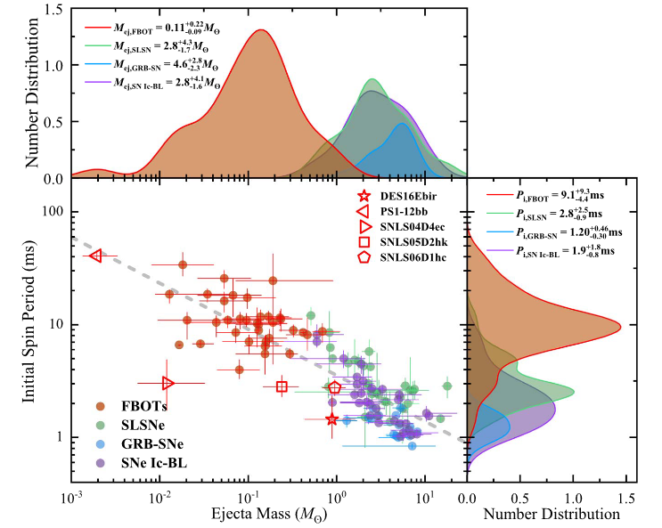 俞云偉教授領(lǐng)導(dǎo)的課題組曾于2015年率先提出了FBOT的毫秒磁陀星能源模型,并在隨后數(shù)年內(nèi)探討了多種可能的磁陀星形成通道。在此次研究工作中,他們進(jìn)一步基于PS1-DMS、DES-SN、SNLS、HCSSP以及PTF各大暫現(xiàn)源巡天觀測(cè)項(xiàng)目的觀測(cè)結(jié)果,實(shí)現(xiàn)了對(duì)FBOT較大樣本的批量擬合和統(tǒng)計(jì)分析,從而發(fā)現(xiàn)了FBOT磁陀星旋轉(zhuǎn)周期和爆發(fā)拋射物質(zhì)量之間的反相關(guān)關(guān)系,并據(jù)此揭示了FBOT和超亮超新星、寬線Ic型超新星以及伽馬暴成協(xié)超新星之間的緊密聯(lián)系(如圖1所示)。基于現(xiàn)有的恒星演化模擬結(jié)果,Mej-Pi反相關(guān)關(guān)系預(yù)示著這幾類特殊的極端恒星爆發(fā)現(xiàn)象可能均源自于致密星-恒星雙星系統(tǒng),致密星伴星對(duì)不同類型恒星的潮汐作用是導(dǎo)致極端爆發(fā)的主要原因,這位最終揭示FBOT的起源提供了重要線索和方向。