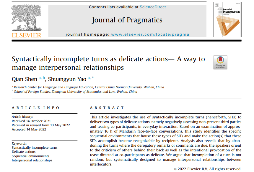 華大在線訊(通訊員 龔睿)近日,語言與語言教育研究中心姚雙云教授及其團隊在漢語口語語法研究中取得新的進展,在語用學國際知名期刊Journal of Pragmatics第197期上發(fā)表題為“Syntactically incomplete turns as delicate actions— A way to manage interpersonal relationships”的研究論文。該文為我校博士生沈謙和導師姚雙云教授合作發(fā)表,是國家社科基金重點項目的階段性成果,也是該團隊第二次在該刊物發(fā)表重要成果。