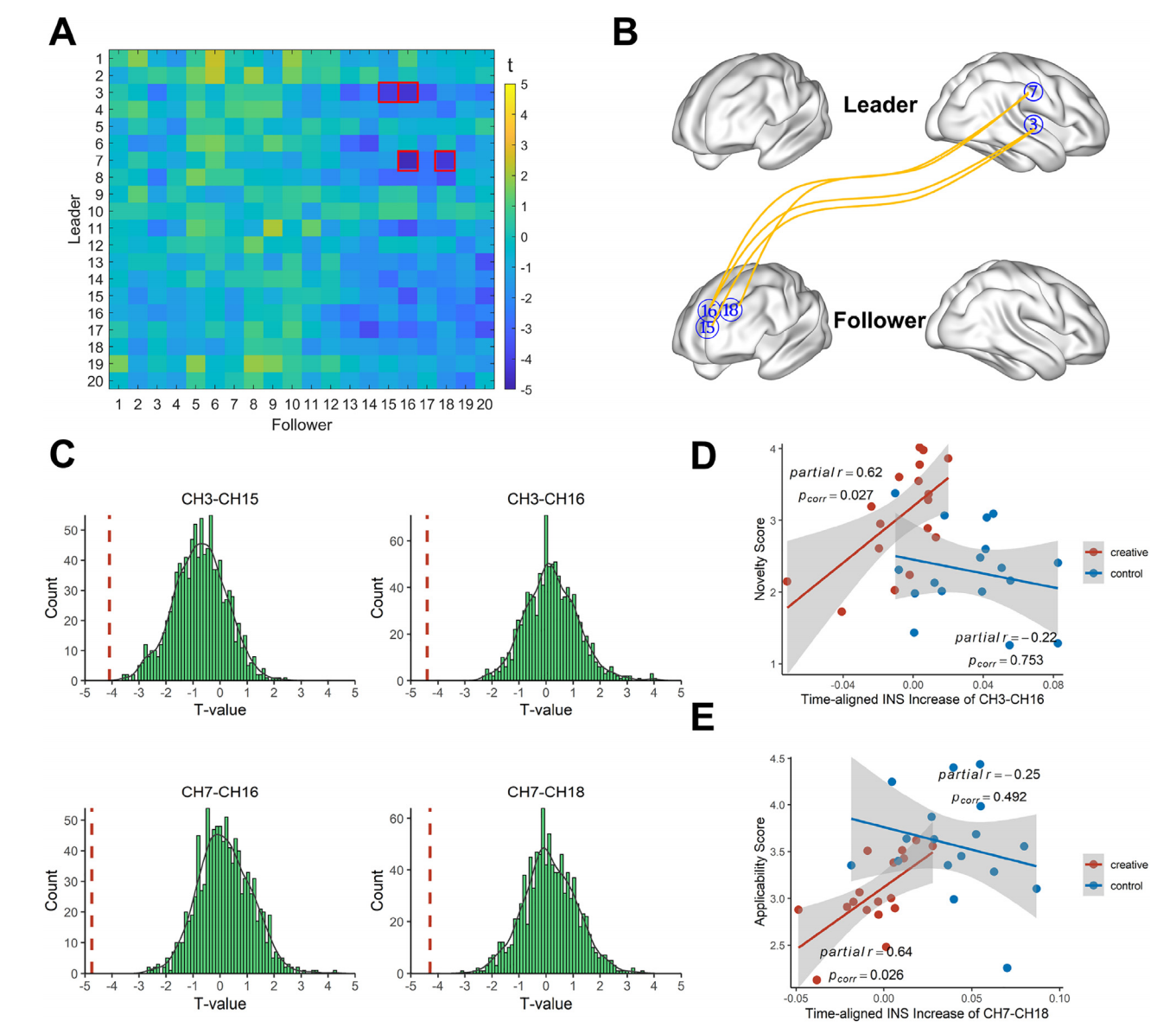 圖2:團(tuán)體創(chuàng)造中思路引領(lǐng)者和追隨者的大腦間神經(jīng)同步及其與觀點創(chuàng)造性的關(guān)系