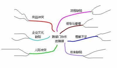在每一階段的對話中,主管們通過頭腦風(fēng)暴的方式找出所有相關(guān)因素,如影響跨部門協(xié)作的可能原因。接著,大家共同對各個要點進行歸類,再確定出幾個關(guān)鍵主題,如“主要原因”。每個小組進行任務(wù)劃分,重點研討特定的一、兩個主題。每個小組都會在一張大白紙的中心畫出主題,而后將每個人想到的要點用曲線與主題連接起來。對分歧進行討論,然后每個小組都會畫出一幅獨特的“思維導(dǎo)圖”(如圖1、圖2、圖3)。當(dāng)小組之間分享討論結(jié)果時,他們都將自己畫的思維導(dǎo)圖帖到墻上,所有的人都來回走動,了解其他組的成果,并請對方解釋其中不明白的部分。然后他們展開討論,并進一步完善原有的思路,或是轉(zhuǎn)換原有的思維視角。最后,整合三個小組的觀點,畫出最后的思維導(dǎo)圖(圖4)。